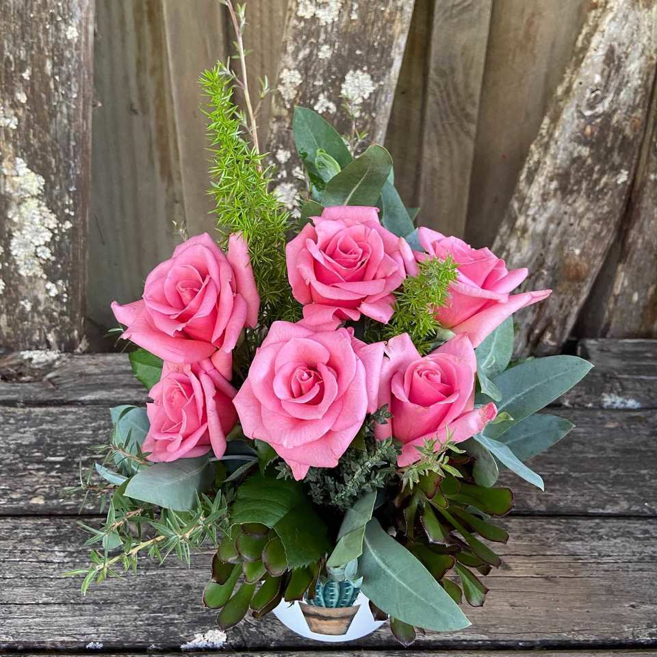 A delicate pot arrangement of 6 beautiful Pink Roses arranged in a floral container, just a perfect gift for Mum's kitchen or dining table. An easy care little garden inside! Pots flowers/foliage may vary due to what's available at the time, but this bouquet will still look cute, adorable and just do the trick :-)