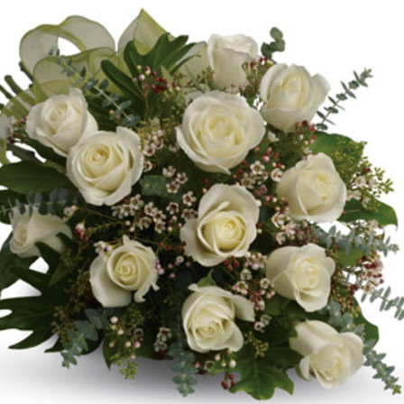 This beautiful flower bouquet of dreamy white dozen roses and graceful greens delivers innocence and elegance. Perfect for neighbours, corporate partners and events.