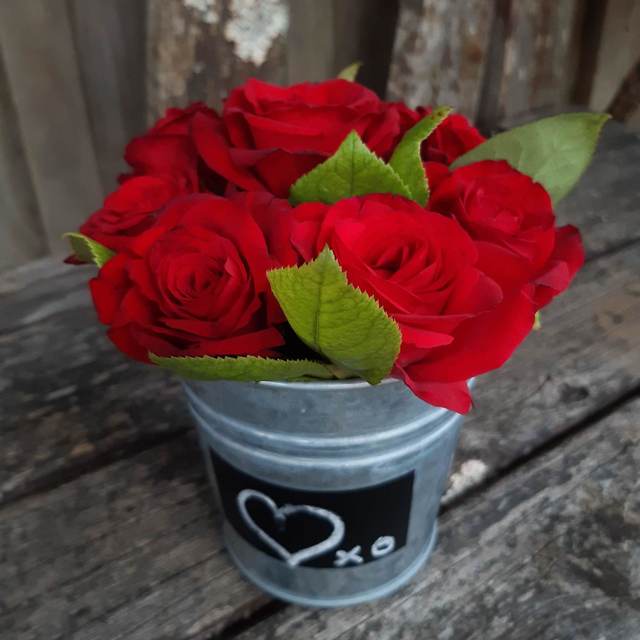 10 short stem Red roses tightly packed into a small container is a perfect posy gift for your loved one or valentine.