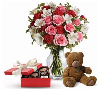 Send this beautiful gift set includes, Gorgeous mix of one dozen roses in an elegant vase or Classic Jar with yummy chocolates and a Teddy for love!