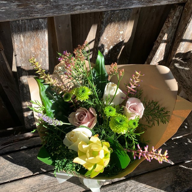 A cute box presentation of our beautiful roses, seasonal flowers and foliage. These are short stemmed standard flowers. Please advise on checkout what colour pallet you prefer.