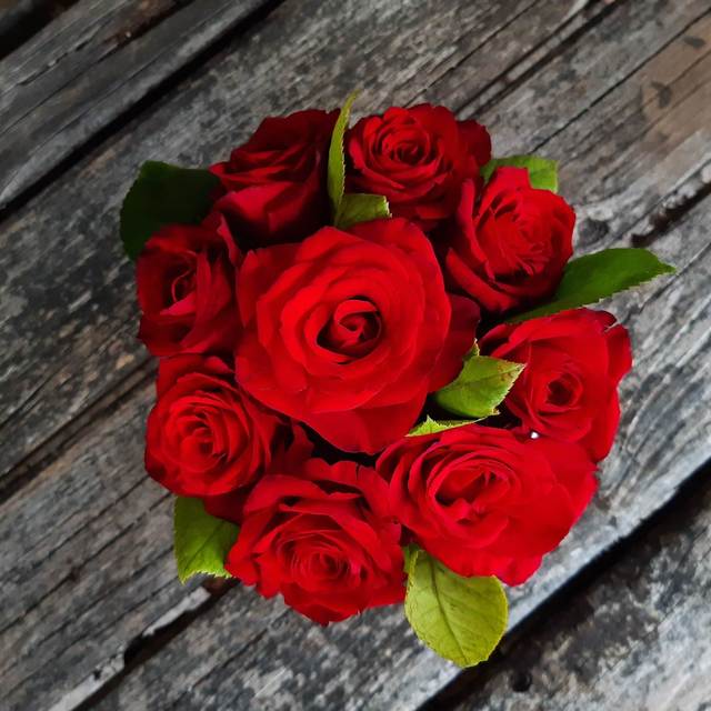 10 short stem Red roses tightly packed into a small container is a perfect posy gift for your loved one or valentine.